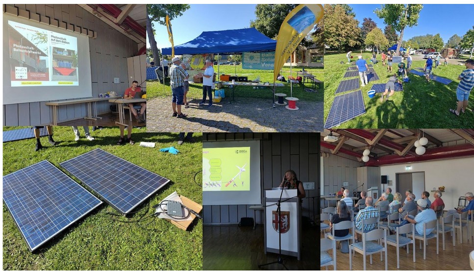 Zum Auftakt konnte man sich ab 13.30h über Balkonkraftwerke informieren. Referent Sebastian Müller vom Balkon Solar e.V. führte in einem Überblicksvortrag in das Thema ein. Hierbei wurden einerseits die rechtlichen Rahmenbedingungen und politischen Entwicklungen zu Steckersolargeräten vorgestellt, als auch Anregungen für Anbringungsmöglichkeiten von Solarmodulen gegeben. Neben passend ausgerichteten Balkonen können Module auch im Garten, auf Garagen oder sogar als Zaunelemente senkrecht montiert werden. Limitierender Faktor, dass eine Anlage als Balkonsolar oder Steckeranlage gilt, ist weniger die Anbringung an einem Balkon, sondern die Limitation, dass die Leistung der verwendeten Panels in Summe maximal 2000 Watt (peak) betragen darf und der angeschlossene Wechselrichter zur Umwandlung des von den Solarpanels gelieferten Gleichstrom in netztauglichen Wechselstrom maximal 800 Watt abgeben darf. Am Wechselrichter befindet sich üblicherweise ein normaler Schuko-Stecker, der in eine Außensteckdose eingesteckt wird und den erzeugten Strom „rückwärts“ in das Stromnetz der Wohnung oder des Hauses einspeist. Mit den zulässigen max. 800 Watt können alle gängigen Grundverbraucher wie Kühlschränke (ca. 80-100 Watt), Fernseher (ca. 80-100 Watt), Laptops (ca. 100 Watt) oder die Beleuchtung (LED 6-15 Watt) versorgt werden.